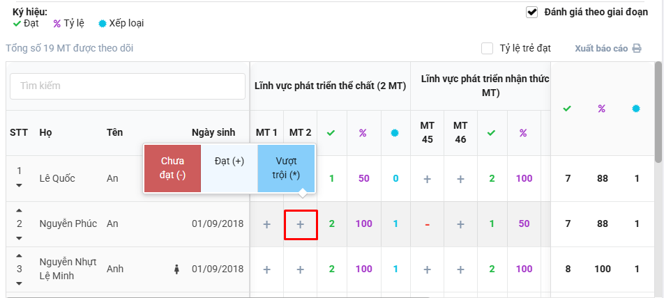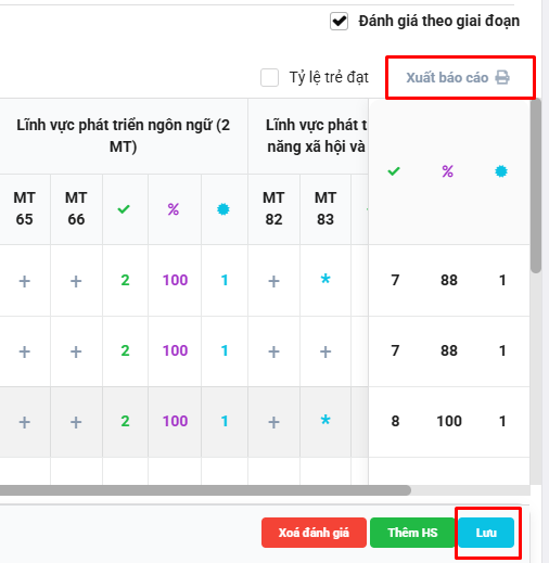 Bước 5: Check vào ô vuông Đánh giá theo giai đoạn để hiển thị bảng đánh giá trẻ theo giai đoạn.